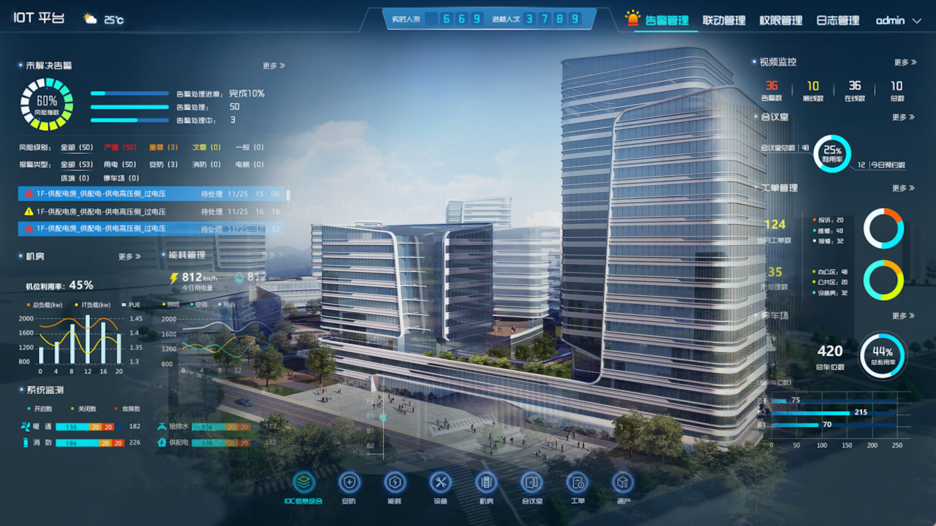 平台对安防监控、停车管理、门禁系统、一卡通、智慧照明、动环系统、电梯系统、能耗系统、楼宇自控、紧急求助、应急广播、信息发布 、智慧会议、智慧消防的统一管理,实现对各子系统监、控功能。